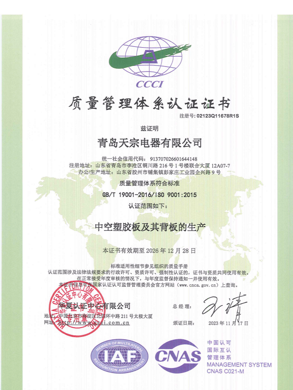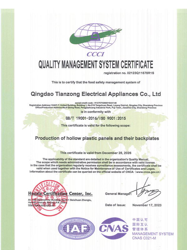 Qingdao Tianzong Electrical Applances Co, Ltd. was established in 2007 and is located in Qingdao, an important port city in China. It is a company with extensive experience in producing plastic hollow boards, specializing in manufacturing durable and environmentally friendly PP hollow boards for various industries. Currently, it serves multiple fields including home appliances, automobiles, advertising, construction, and electronic components. The company adheres to the business principle of honesty and integrity, working together to create value for customers, society, the enterprise, and individuals. We welcome friends from home and abroad to join us and cooperate with us!