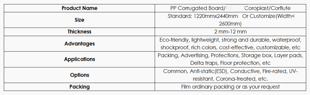 Corrugated plastic boards/sheets are a kind of plastic board made of eco-friendly polypropylene material, which have the characteristics of non-toxic, non-polluting, waterproof, shockproof, anti-aging, corrosion resistance, and rich colors.